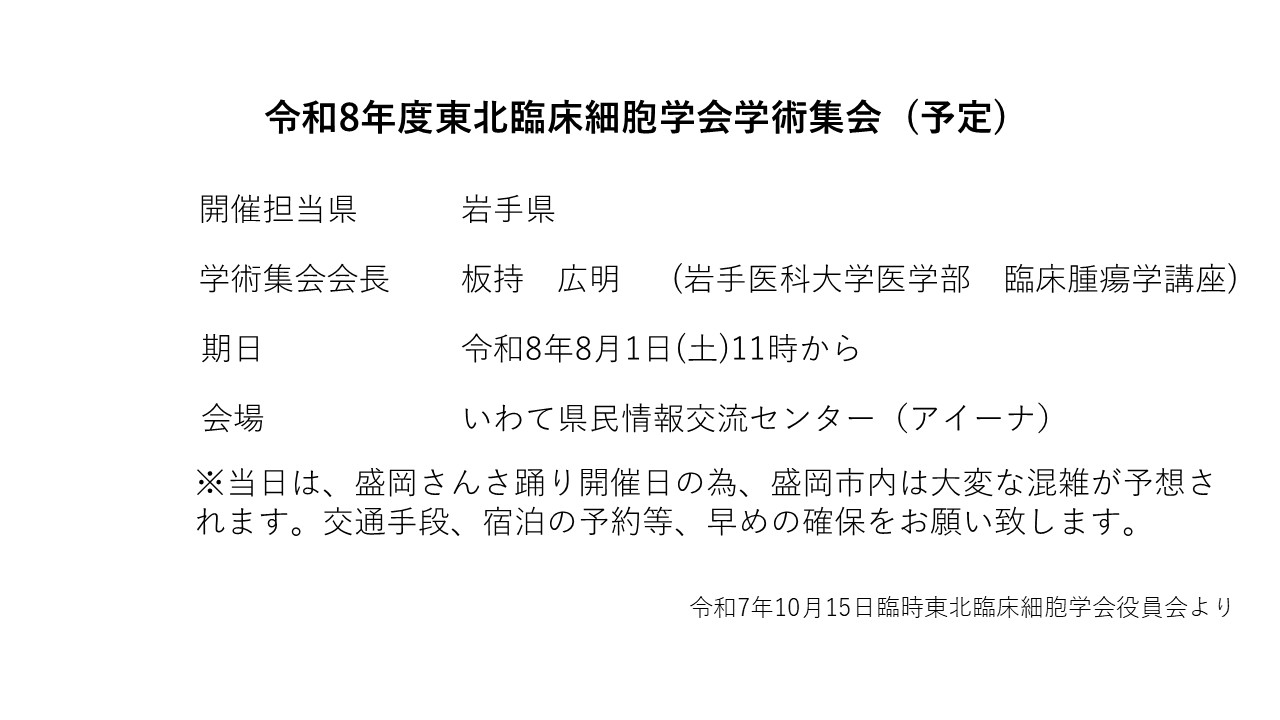 第62回東北臨床細胞学会学術集会の開催日が、令和8年8月1日土曜日に変更となりました。開催場所は、いわて県民情報交流センター(アイーナ)です。詳細は後日公開します。